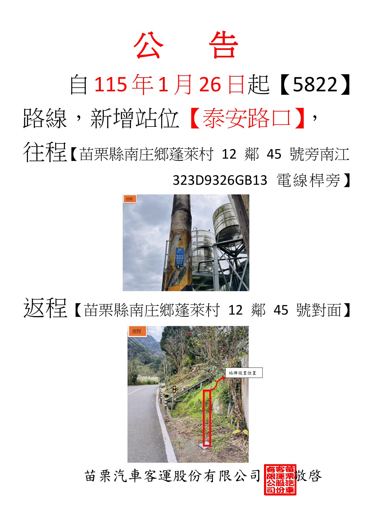 自115年1月26日起 【5822】路線,增站【泰安路口】