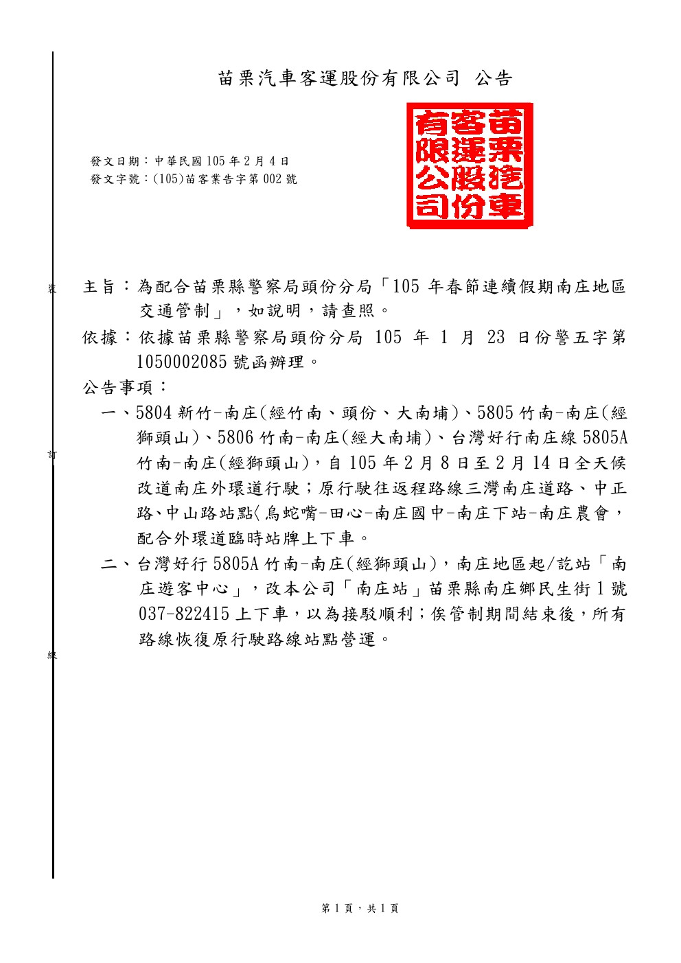 「105年春節連續假期南庄地區交通管制」說明公告