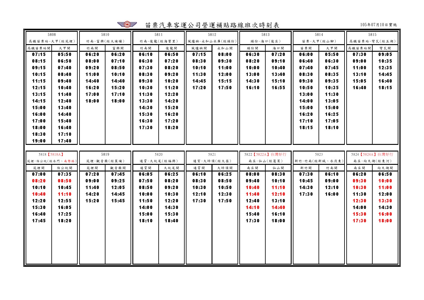 公路客運最新調整班次時刻表(105年7月10日起實施)