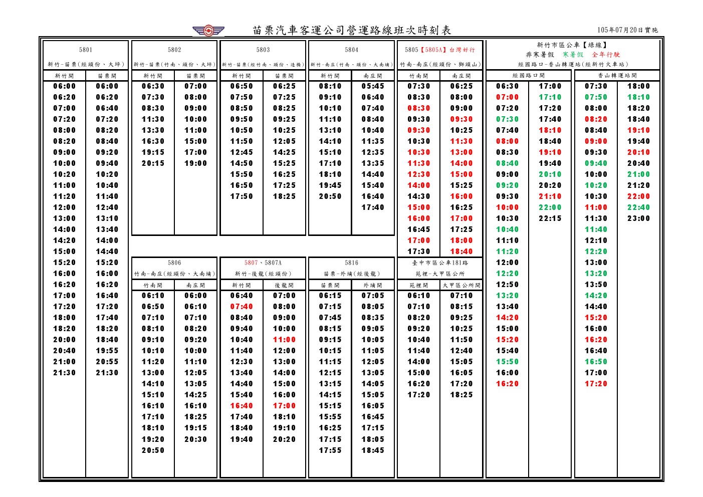 公路客運最新調整班次時刻表(105年7月20日起實施)