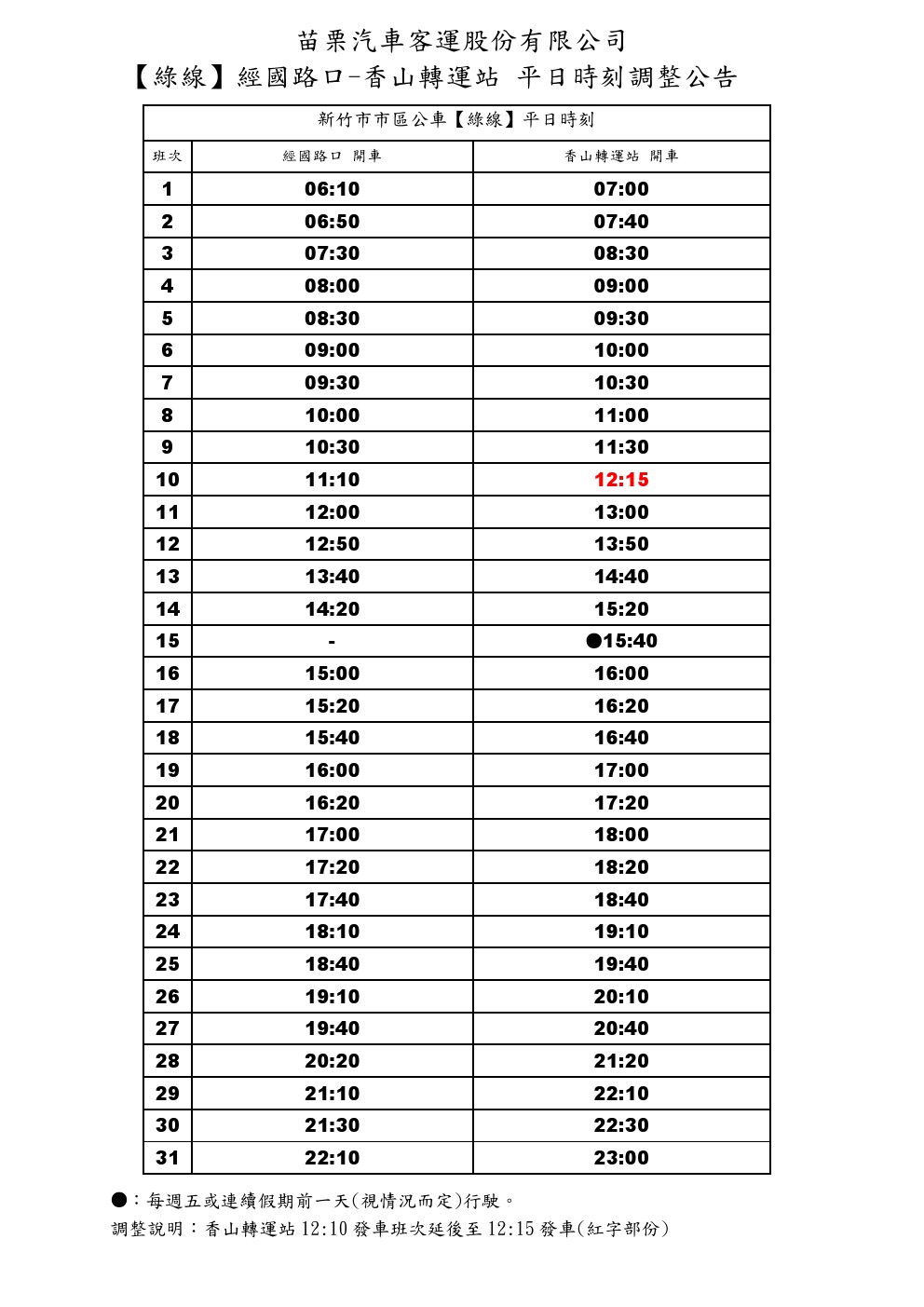 【新竹市區綠線公車】平日時刻調整班次一覽表