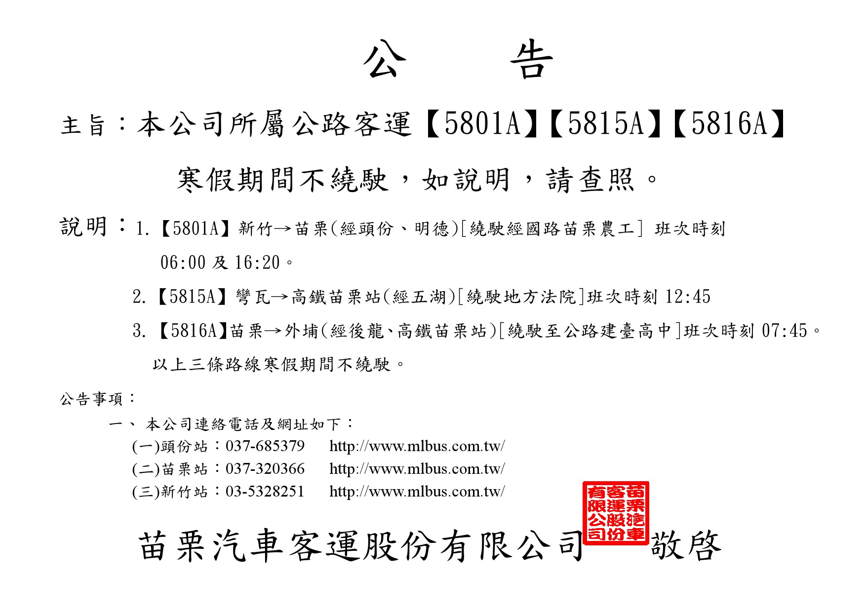 本公司5801A、5815A、5816A寒假期間不繞駛