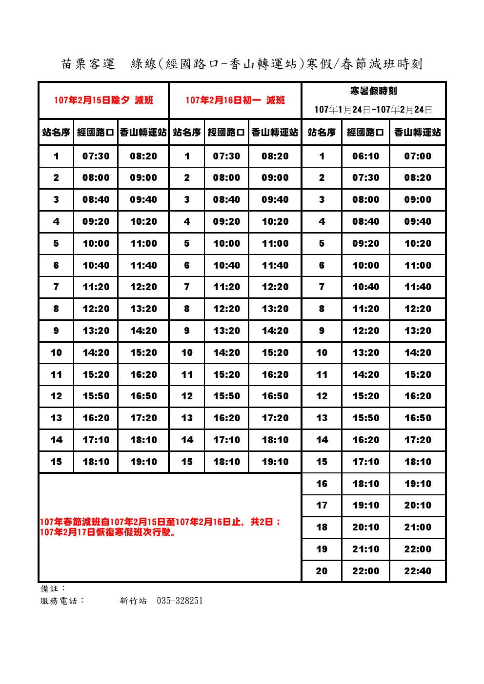 107年度【新竹市區公車-綠線】春節減班班次一覽表