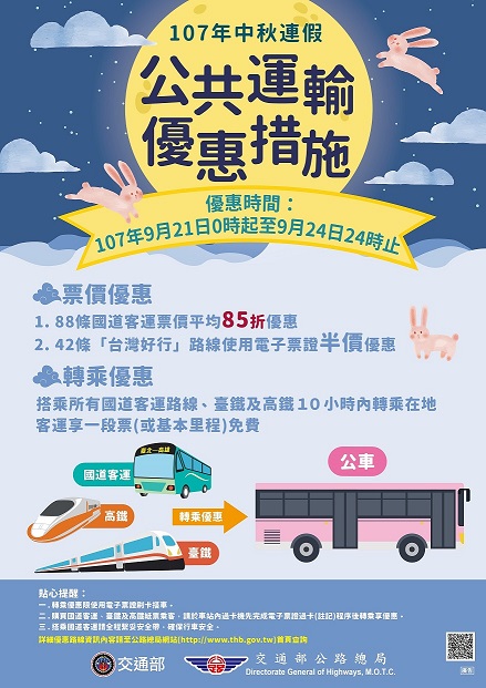 107年中秋連假(9月21日0時起至9月24日24時止)搭乘國道客運及『台灣好行』享票價折扣優惠;另搭乘國道客運、台鐵及高鐵享轉乘在地客運優惠,敬請多加搭乘利用,詳細優惠資訊請至公路總局網站查詢(