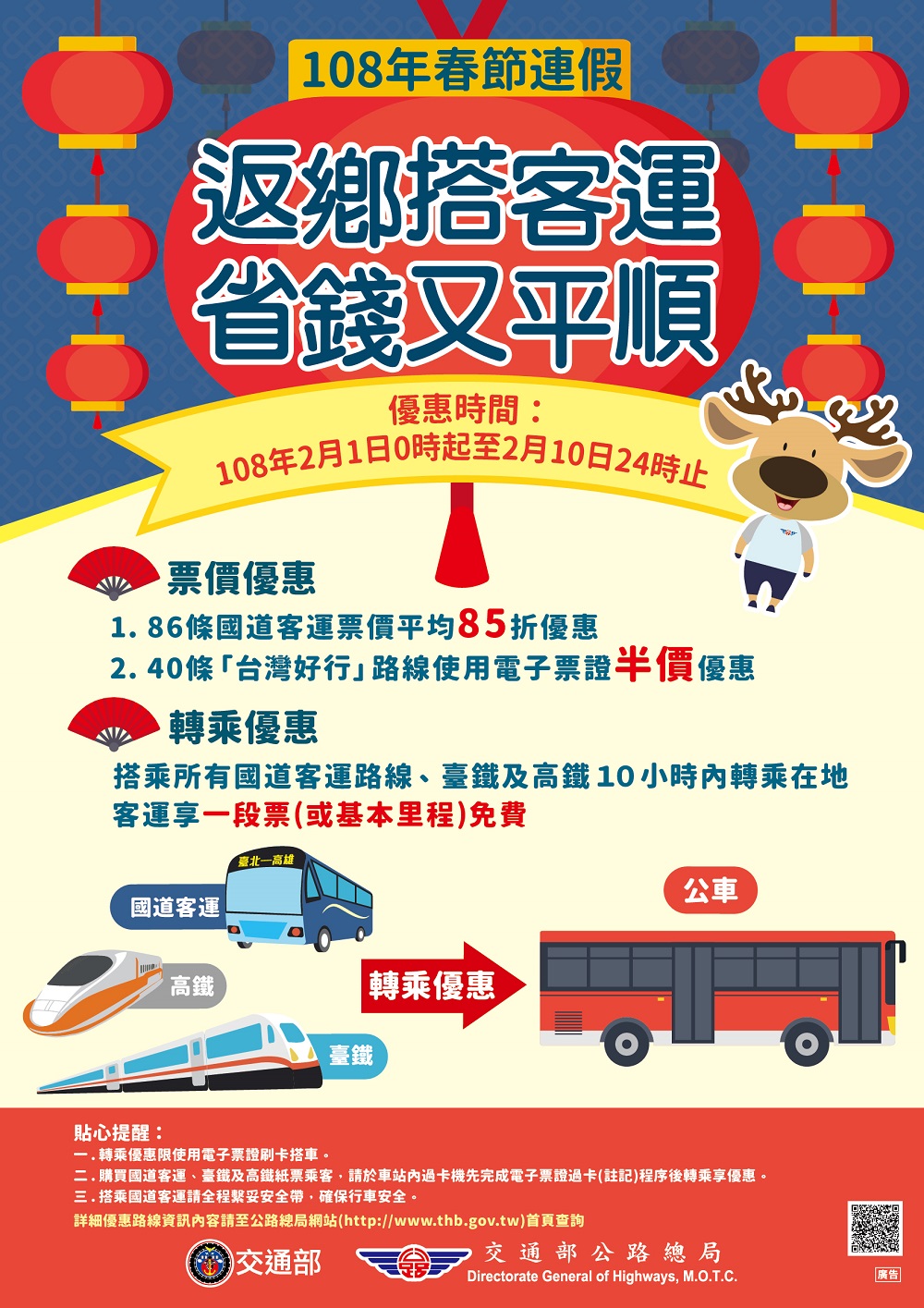 「108年春節連假搭乘公共運輸轉乘享優惠」,搭乘國道客運85折及『台灣好行』半價折扣優惠;另搭乘國道客運、臺鐵及高鐵等10小時內轉乘在地客運享一段票免費優惠,敬請多加搭乘利用,詳細優惠資訊請至公路總局網站查詢。.