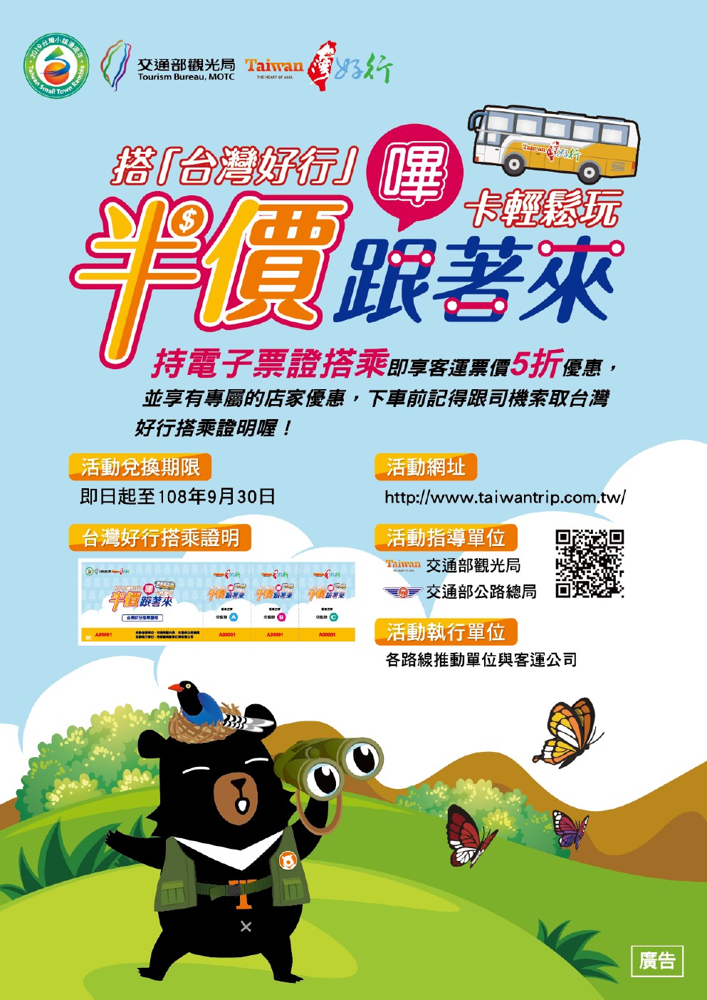 108年暑期(7月1日起至9月30日止)使用電子票證搭乘『台灣好行』享半價優惠,還有商家好康優惠,敬請多加利用,詳細優惠資訊請至『台灣好行』官網查詢。
