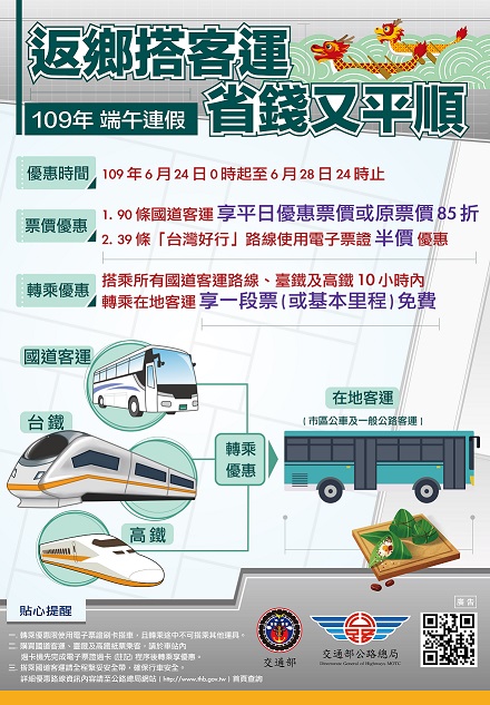 返鄉旅遊搭客運,省錢又平順!109年端午連續假期搭乘國道客運及『台灣好行』享票價折扣優惠;另搭乘國道客運、台鐵及高鐵享轉乘在地客運享一段票免費優惠,詳細優惠資訊請至公路總局網站查詢。