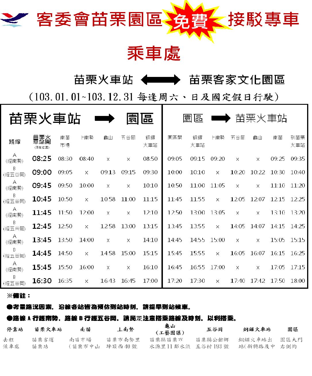 103年客委會苗栗園區免費接駁專車站牌時刻表
