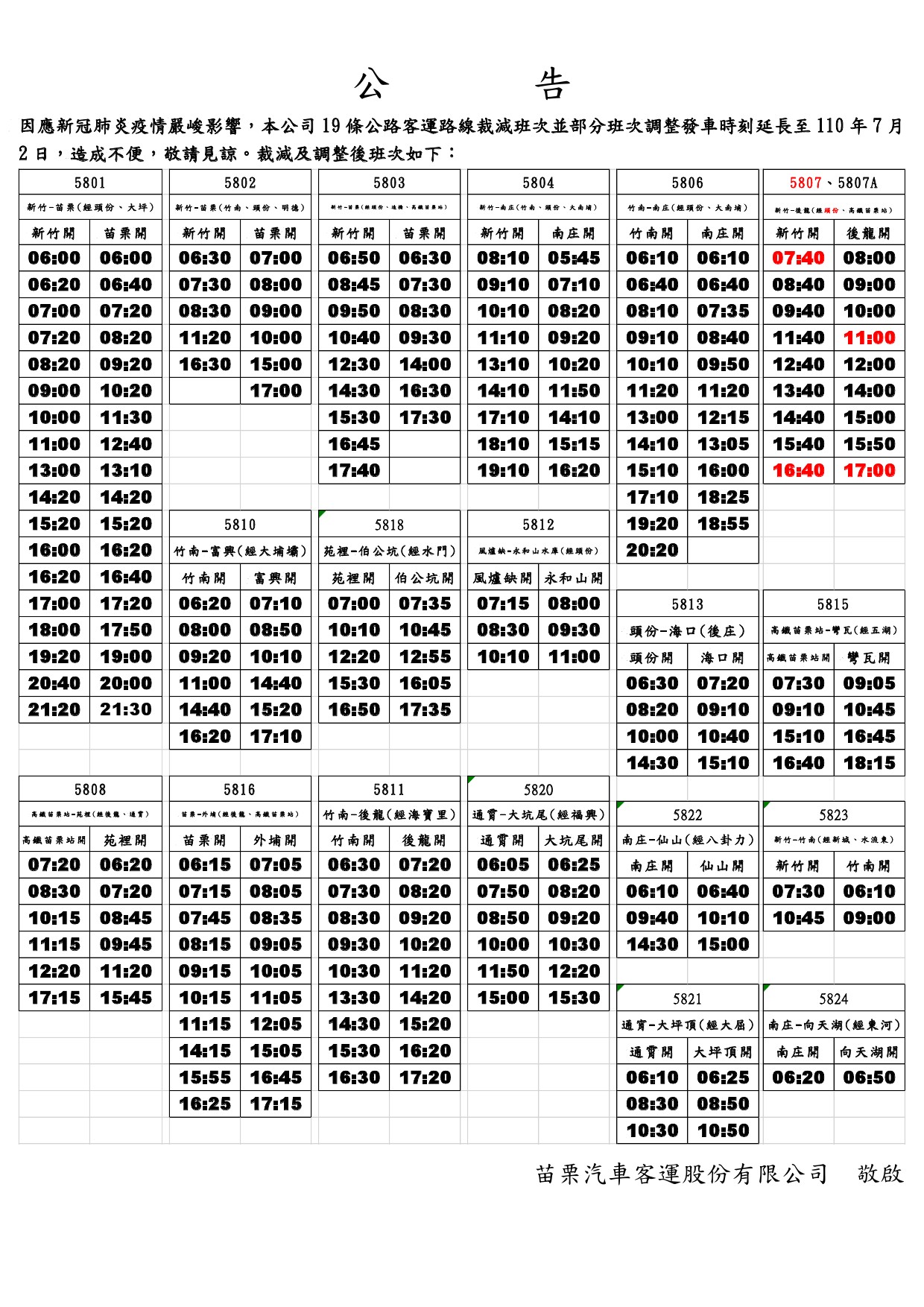 新冠肺炎疫情嚴峻,本公司19條路線減班延長至110年7月2日
