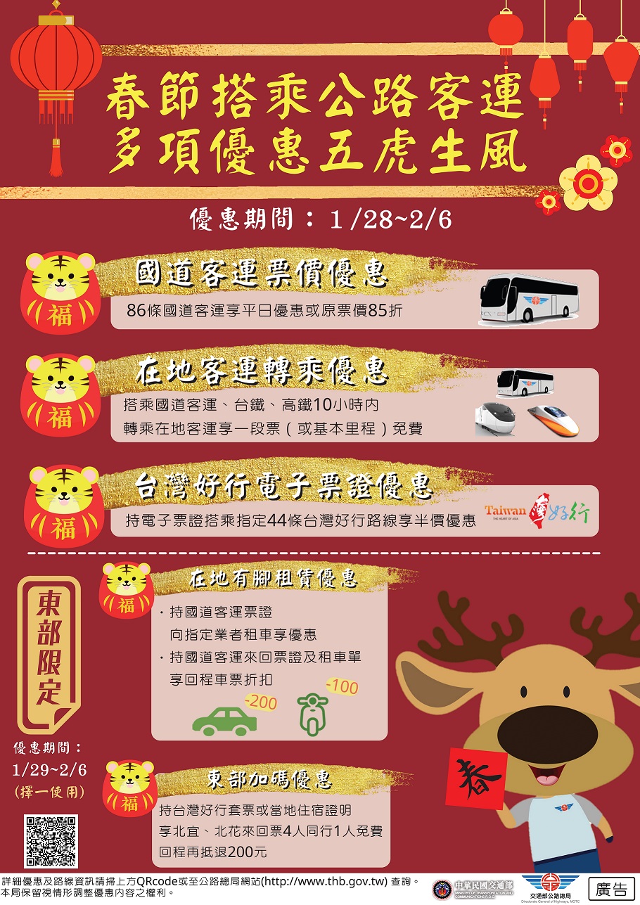 為鼓勵民眾於春節連假期間搭乘公共運輸,紓解國道交通壅塞,自111年1月28日0時起至2月6日24時止,提供國道客運路線享平日優惠票價或原票價85折、搭乘國道客運、臺鐵及高鐵10小時內轉乘在地客運1段票(或基本里程)免費優惠,以及「台灣好行」路線電子票證半價等優惠措施,更多優惠請上公路總局網站查詢。另應中央疫情指揮中心宣布維持第二級警戒,民眾搭乘公路客運,應配合實聯制,上車以手機掃描車上QR code或以紙筆留下個人基本資料,並配合量測體溫,如遇體溫異常(額溫≧37.5℃或耳溫≧38℃),司機將無法提供運輸服務。