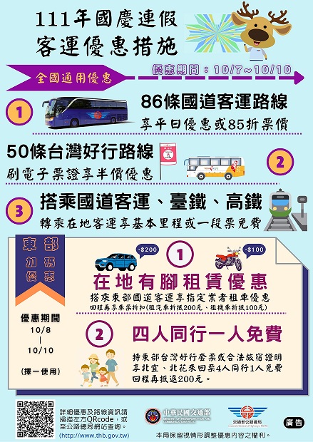 連續假期搭乘國道客運及『台灣好行』享票價折扣優惠;另搭乘國道客運、台鐵及高