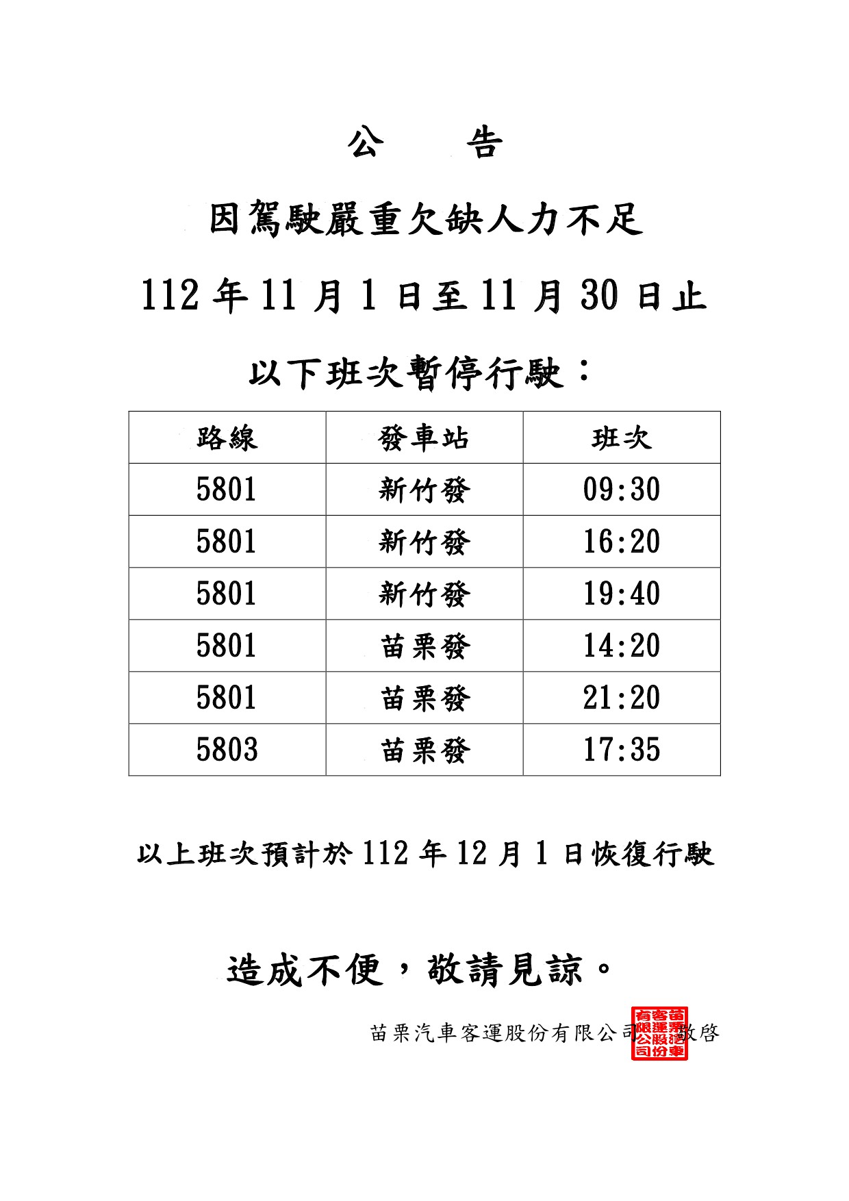 5801及5803於11月1日至11月30日部分班次暫時取消