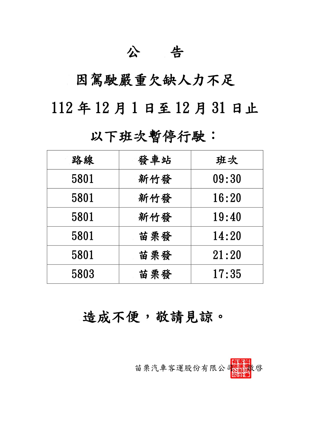 5801及5803於12月1日至12月31日部分班次暫時取消