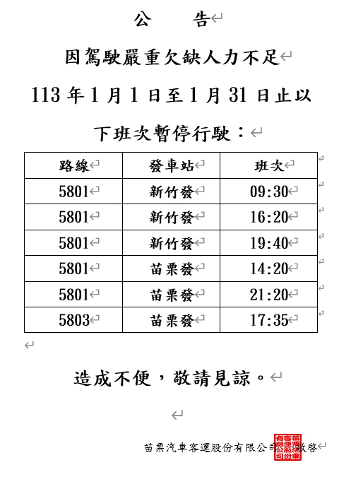 5801及5803於113年1月1日至1月31日部分班次取消