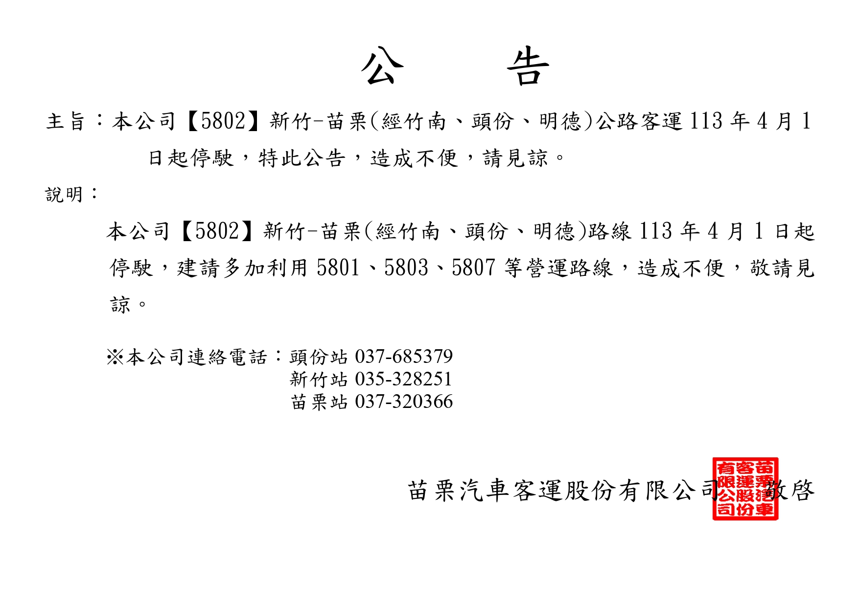 【5802】新竹-苗栗(經竹南、頭份、明德)4月1日起停駛