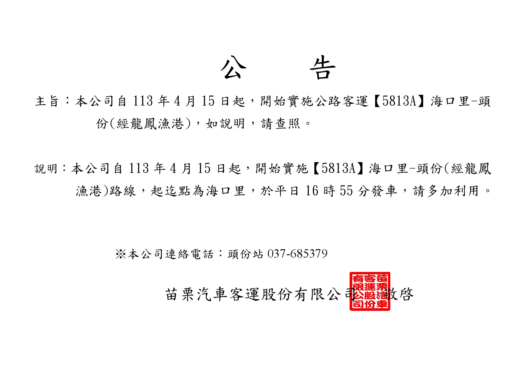 4月15日開始實施【5813A】海口里-頭份(經龍鳳漁港)