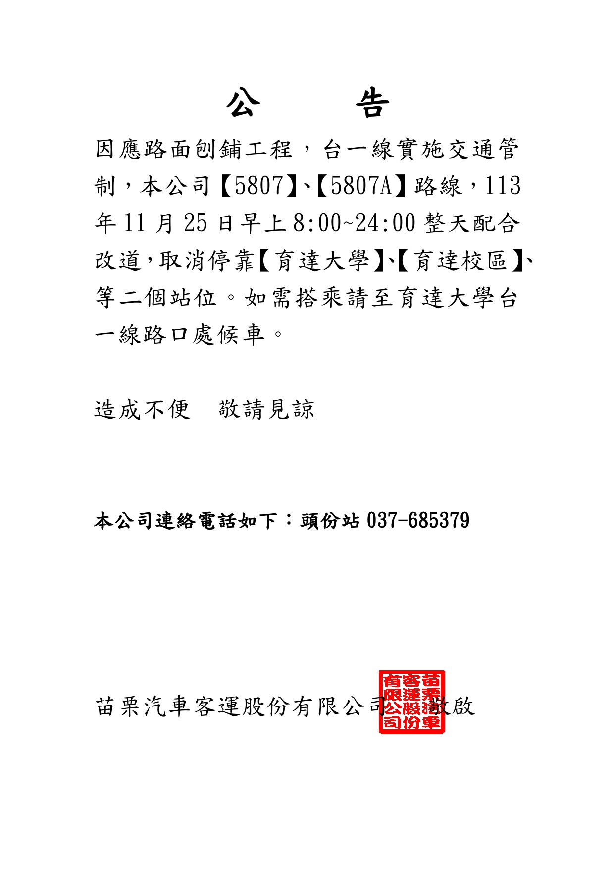 因道路施工,5807、5807A路線不停靠育達大學及育達校區