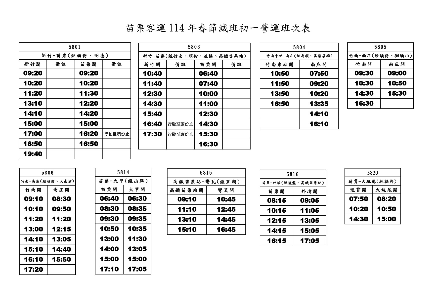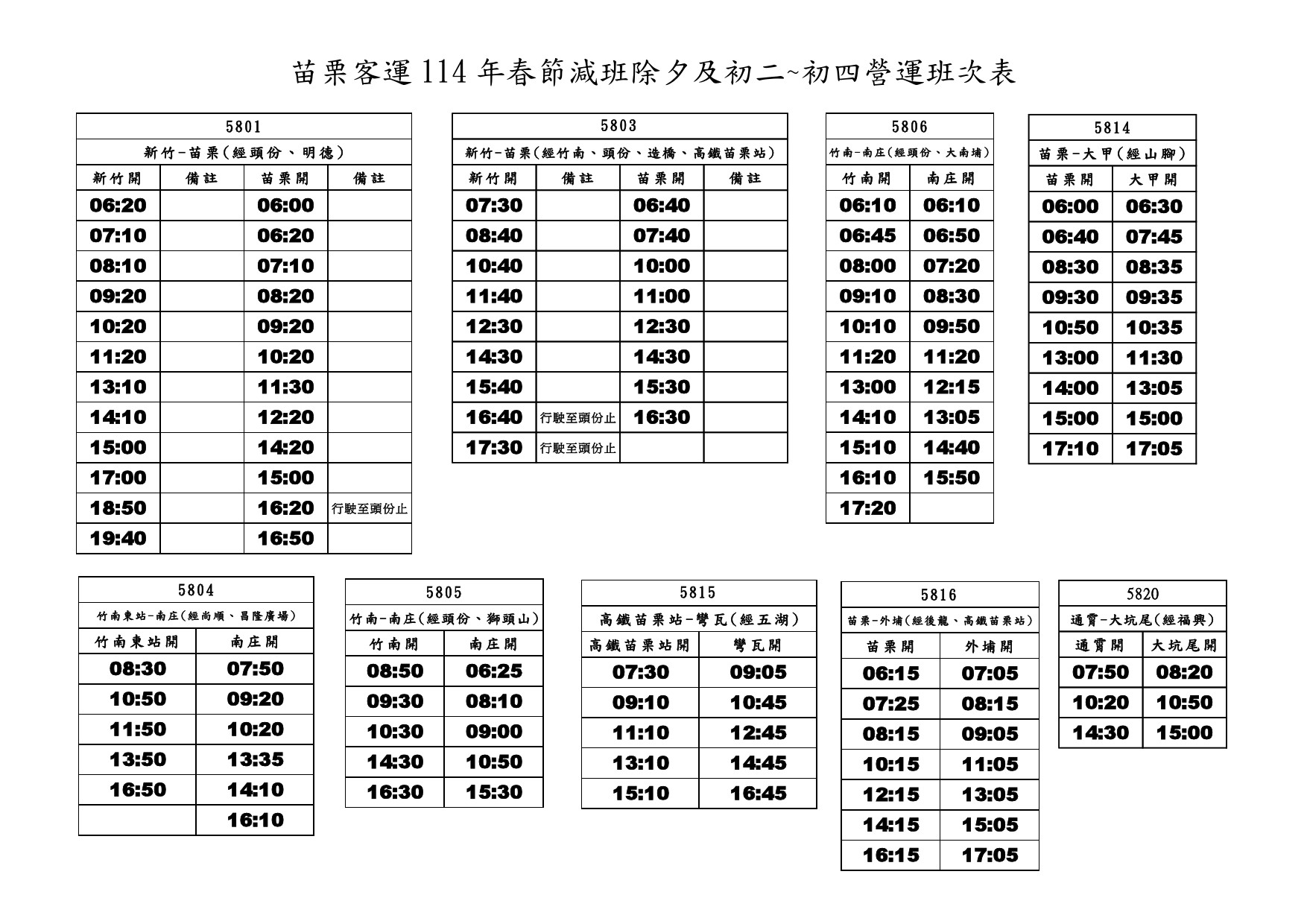 114年春節減班班次表