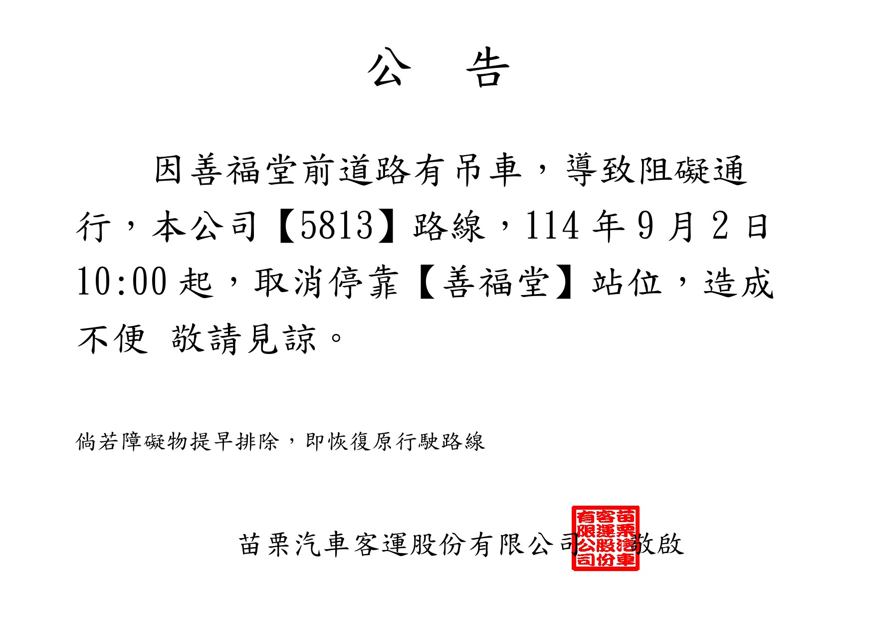 本公司5813路線,因障礙物,暫不停靠【善福堂】