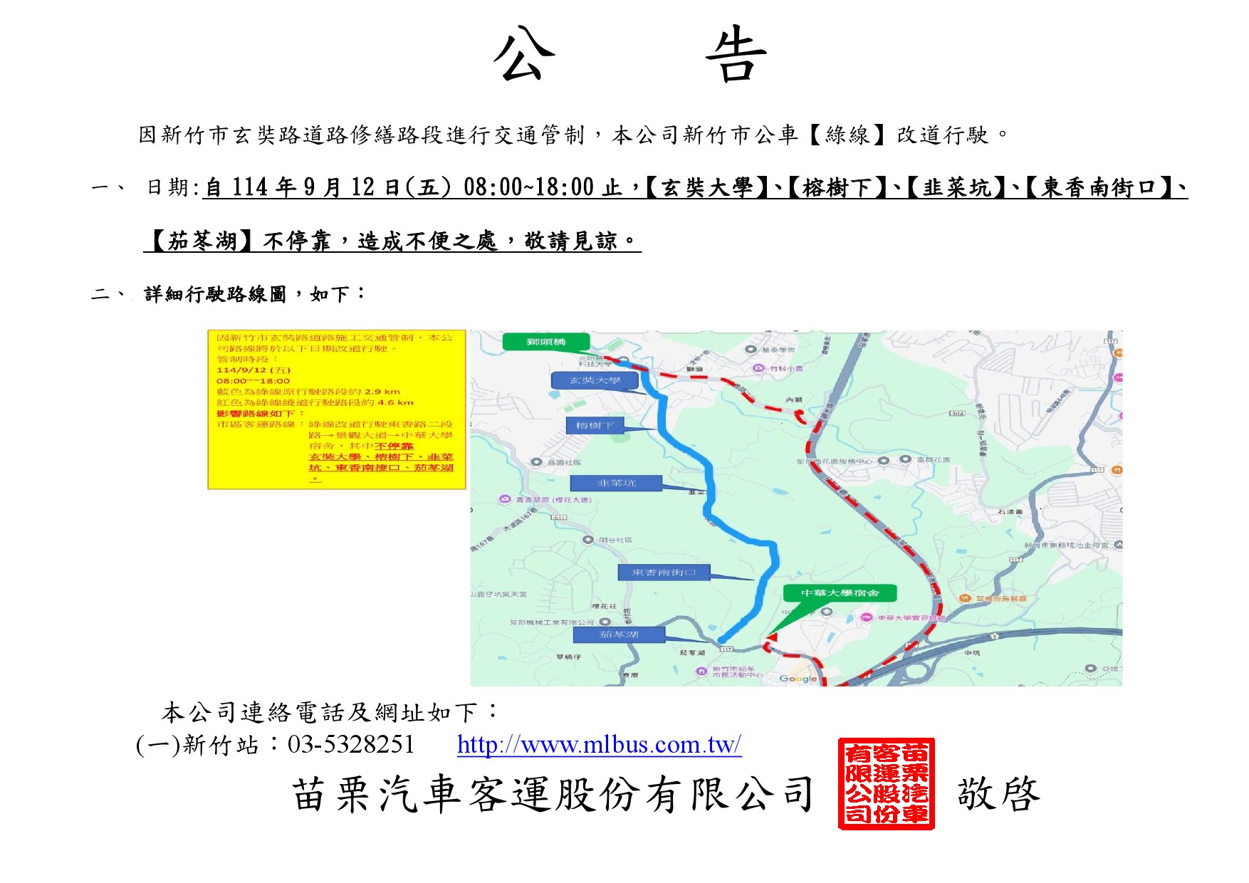 因新竹市玄奘路道路修繕,本公司新竹市公車【綠線】改道行駛
