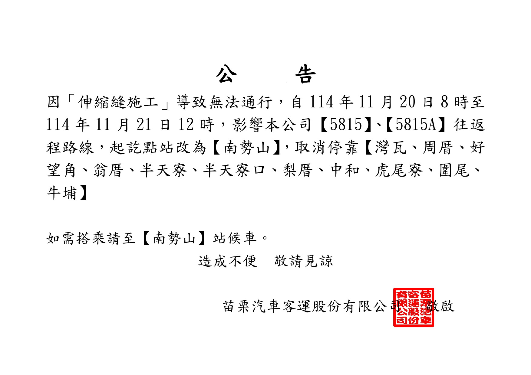 因「伸縮縫施工」導致無法通行,5815 行駛至﹝南勢山﹞止