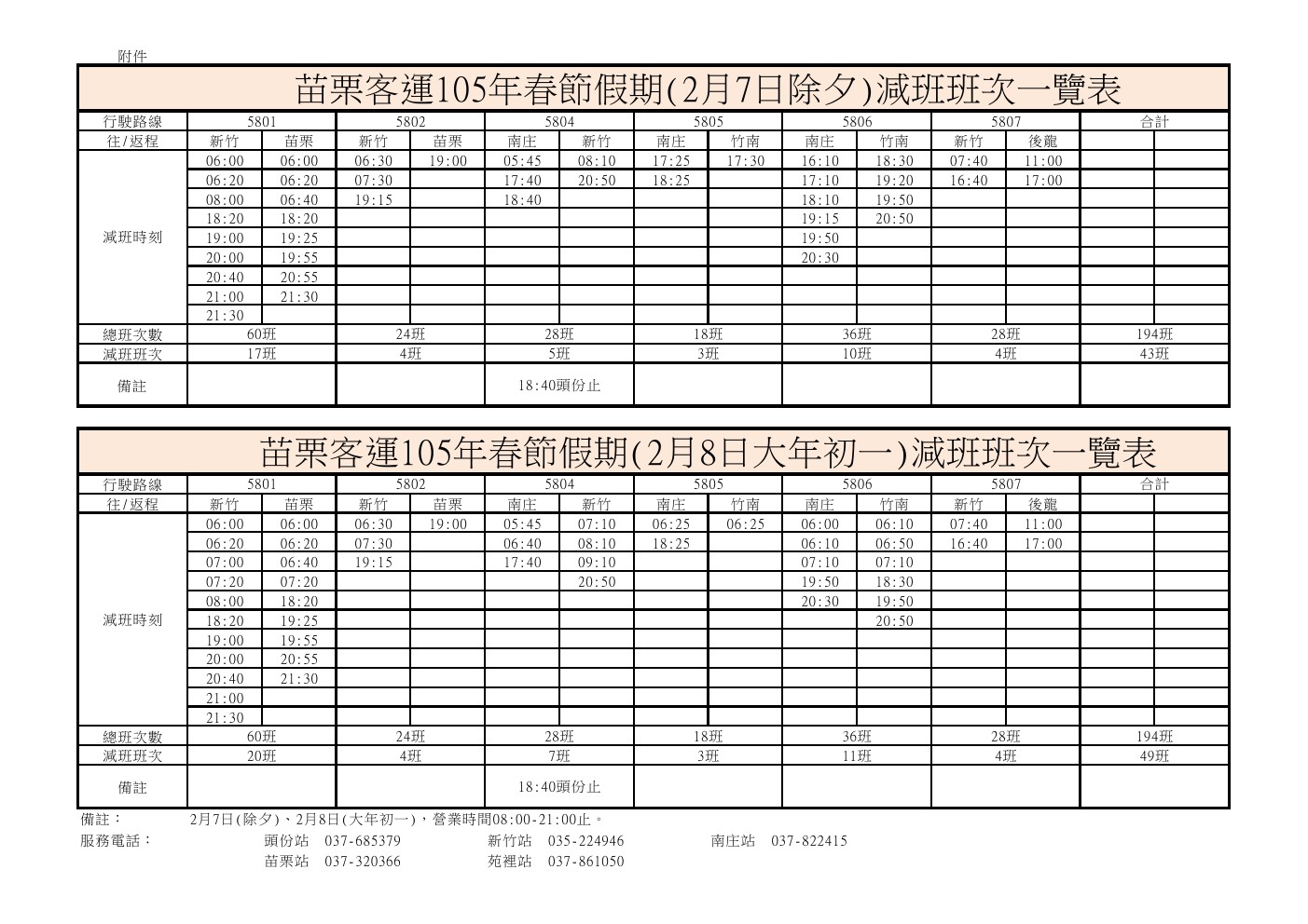 105年度苗栗客運【一般公路客運】春節減班班次一覽表