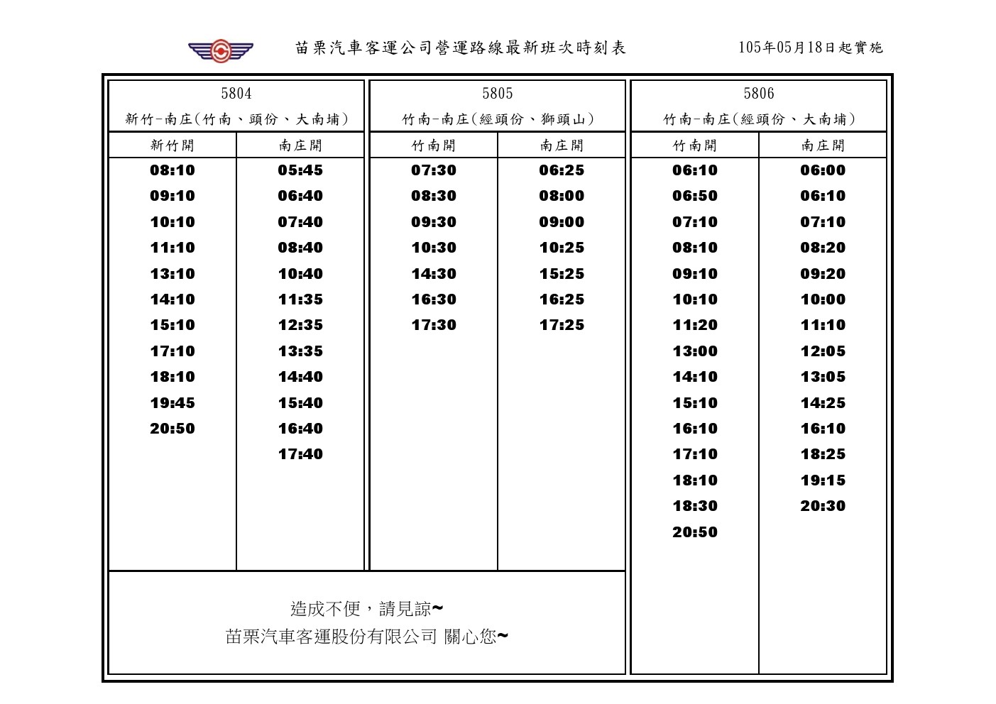 公路客運最新調整班次時刻表(105年5月18日起實施)