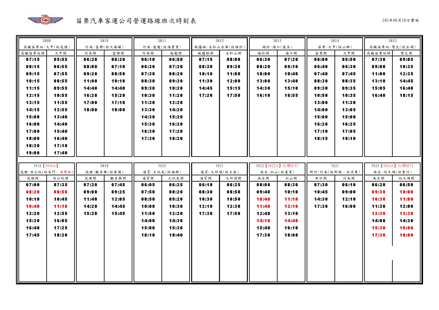 公路客運最新調整班次時刻表(105年6月16日起實施)